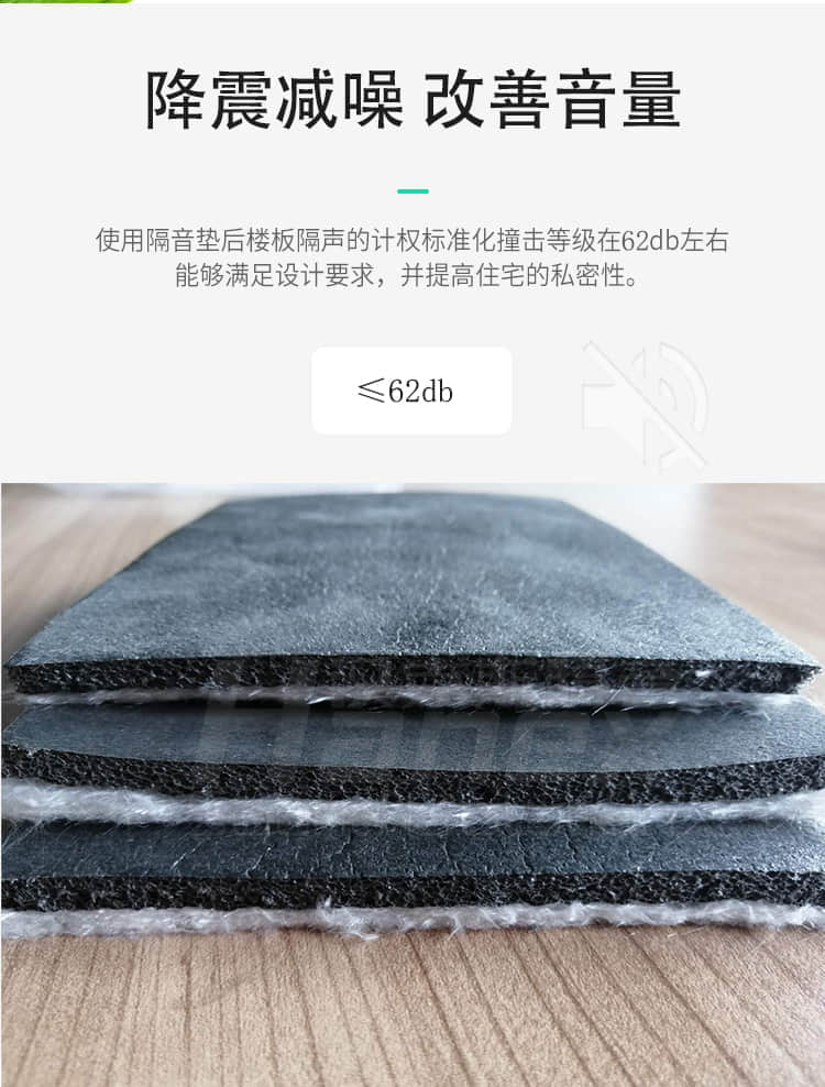 具有隔音好,防水防潮,無毒環(huán)保,隔熱保溫,回彈力好,重量輕,使用壽命長(zhǎng)等特點(diǎn),是解決住宅噪音問題的專業(yè)隔音產(chǎn)品,是一種新型節(jié)能環(huán)保材料。