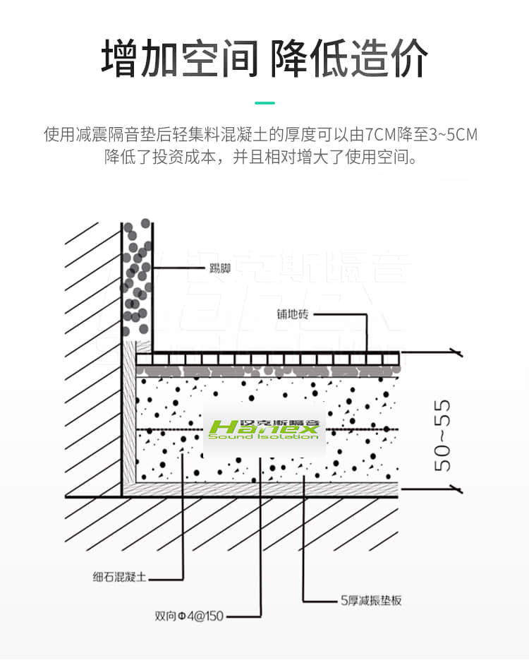 4.性價(jià)比優(yōu)勢(shì):超薄材質(zhì)不以犧牲層高為代價(jià)來?yè)Q取減振保溫的綠色達(dá)標(biāo);柔性材質(zhì)大限度避免裂縫,從而使小成本實(shí)現(xiàn)減振、保溫兩全其美。